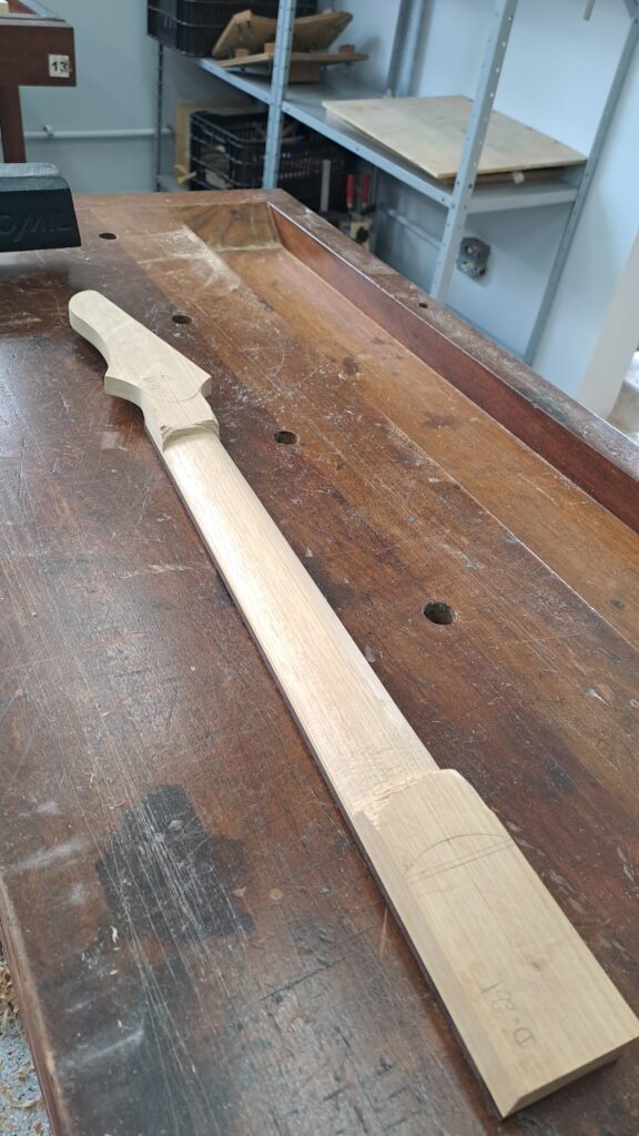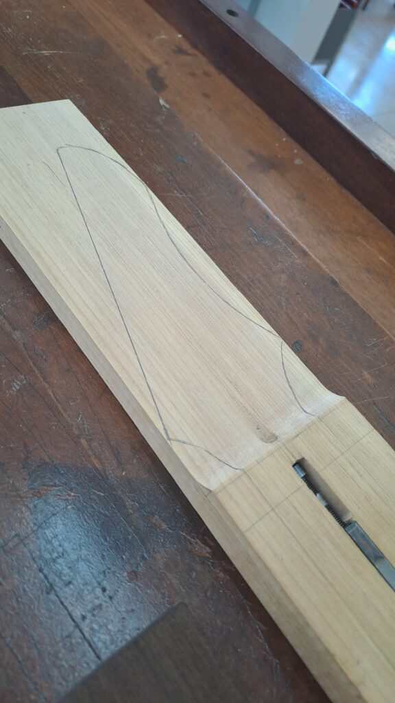 A mão da guitarra será reta, no estilo da Fender. Para rebaixar a mão, usamos a tupia com um jig que permite remover camadas da madeira de maneira uniforme e com a profundidade controlada. Deixamos uma sobra entre a mão e o início do braço para fazer uma transição com uma leve curva. Esta curva entalhamos com a goiva e depois usamos a lixa enrolada em um cano para dar acabamento.