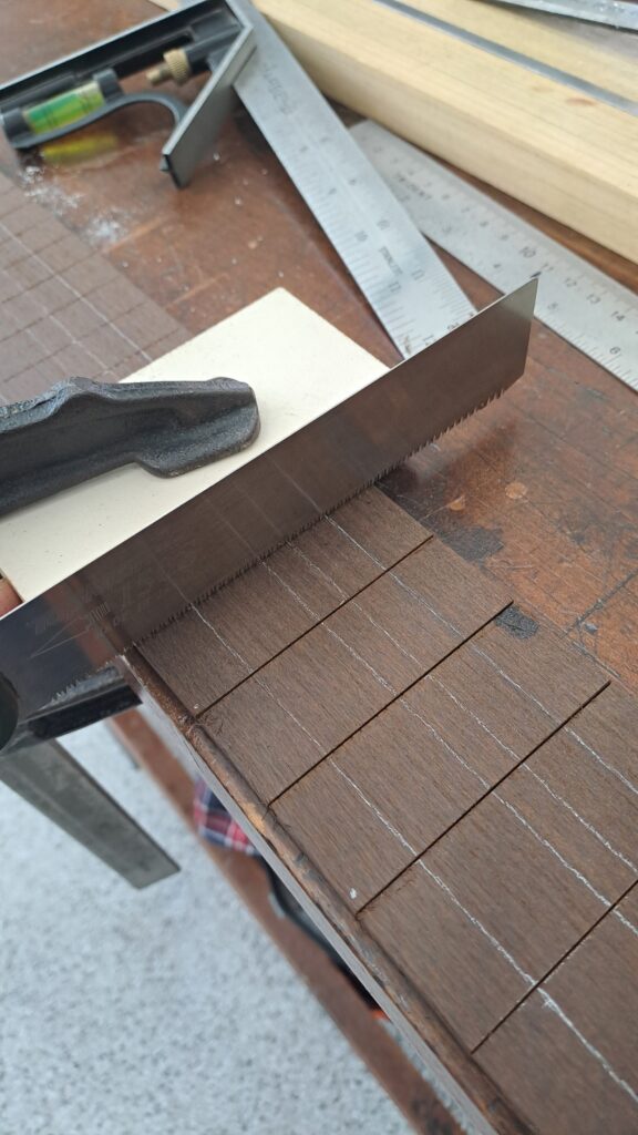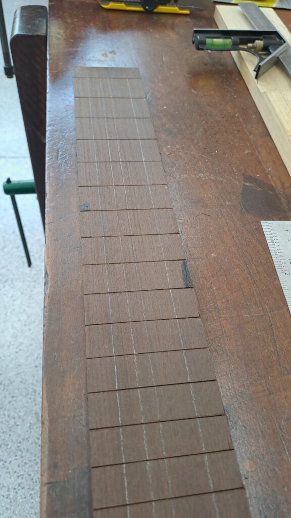 Quando finalmente temos certeza de que cada uma das linhas dos trastes está no lugar exato, começamos finalmente a fazer um pequeno sulco com um serrote japonês. Para garantir que serramos reto, prendemos um bloquinho de MDF para guiar a serra, como pode ser observado na imagem abaixo. Por enquanto, o sulco deve ser fundo o suficiente apenas para marcar o local, pois a escala ainda será arredondada, e por isso serramos apenas até o sulco cobrir os dentes do nosso serrote.