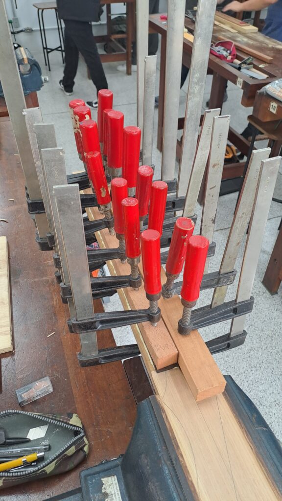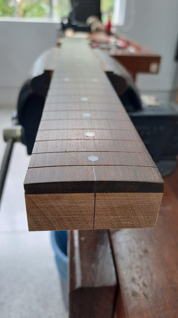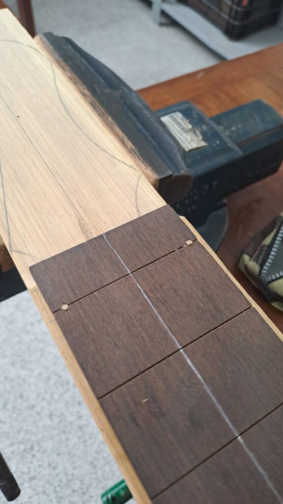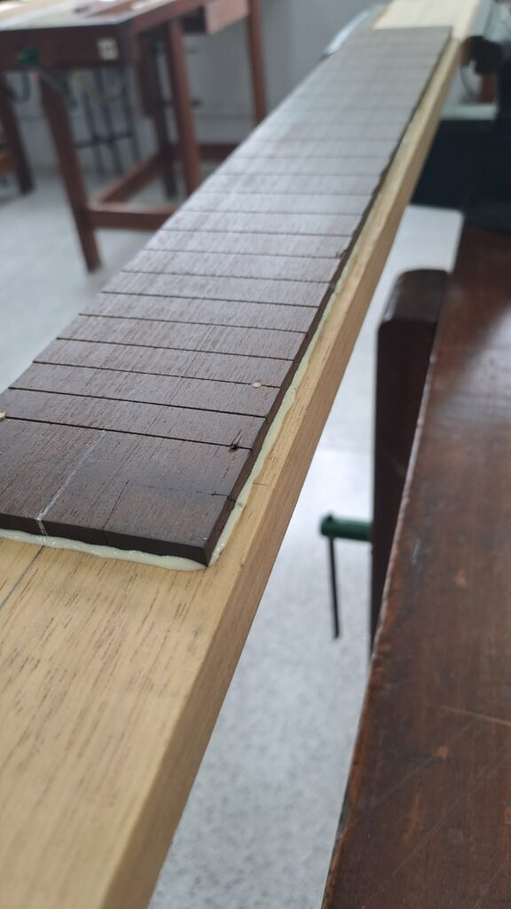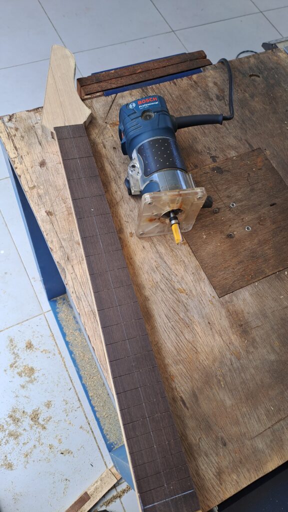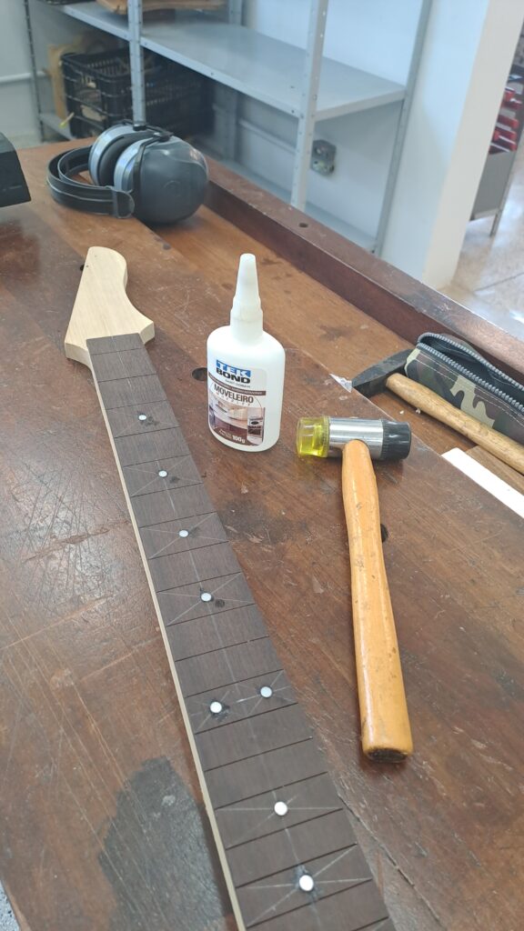 Deposi de sortar os slots para os trasstes, colamos a ecala no braço, e para evita que a escala se desalinha no momento da colagem fizemos alguns furos bem encima dos slots e colocamos um palito de dente para mante a escala no lugar. Para evitar que a cola entre no sulco do tensor passeu um fita por cima do sulco. Depois disso bastou passar cola em ambas as partes( escala ebraço) encaixar a escala com os palitos no buraco e depois prensar bem e deixar secar.