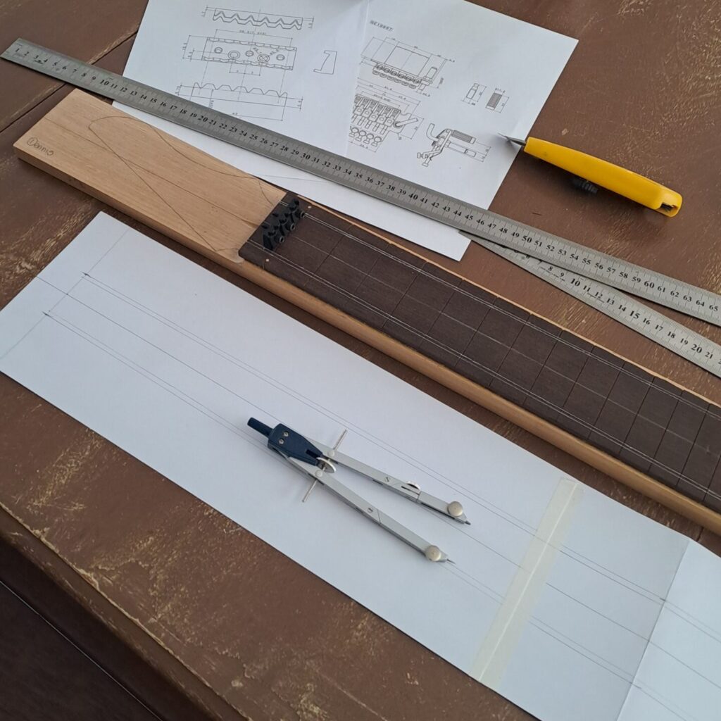Para sabermos a localizaçõ exata de cada um dos trastes, usamos um aplicativo disponível na internet, no qual, basta dar o comprimento da corda e o número de trastes e ele calcula automaticamente a localização de cada um dos trastes. Encontramos este site simplesmente procurando no google por “fret position calculator”. Depois marcamos a localização em cada uma das linhas, e como são três linhas, caso uma das medidas fique fora, é fácil de ver qual é pois há mais duas outras medições com as quis podemos verificar o espaçamento.