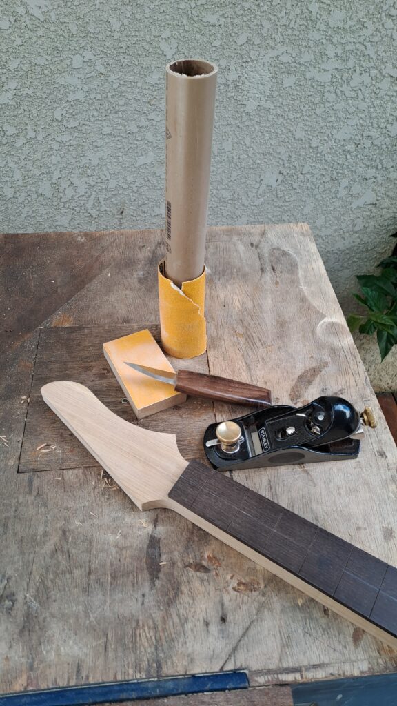 Alé de arredondar a parte de trás do braço, ainda dei uma leve aredonadado na escala, utilizando um taco de raiar e incialmente uma lixa de grão 60, que fui diminuindo gradativamente até a lixa de gra 320, tomando cuidado para não remover os sulcos dos trastes. O taco de raiar que utilizei foi o de 14″, e este tamanho foi decidido de acordo coma curvatura da ponte.