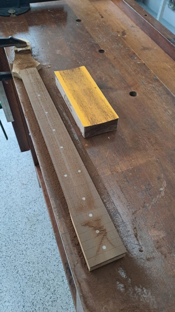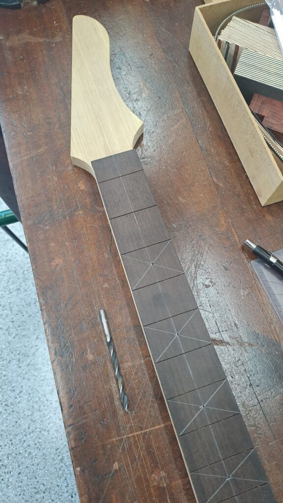 Antes de começar a arredondar o braó e a escala eu ainda aproveitei para colocar os marcadores de escala de madrepérola. Estes marcadores são colocados nas casas 3, 5, 7, 9, duas na 12, na 15 na 17, na 19 e 21. As marcações que eu comprei são de bolinha de 5mm e por sorrte bateu exatamente com a broca de 5mm que eu tinha, mas teste antes de furar a escala pra me certificar. Para marca o local das bolinha na escala eu fiz um “X” e cada uma das casa, fazendo um reta com a régua a cada aresta da casa, já na casa 12 usei as arestas da linha central para fazer o “X” em cada lada, conseguindo, desta forma centralizar as bolinhas no meio da casa, comopode ser observado na imagem abaixo. Para fixar as bolinhas fiz um fura de aproximadamente 2mm e colei as bilinhas com cianoacrilato. No final ainda passei uma lixa sobre as marcações para deixá-las na mesma altura que a escala.