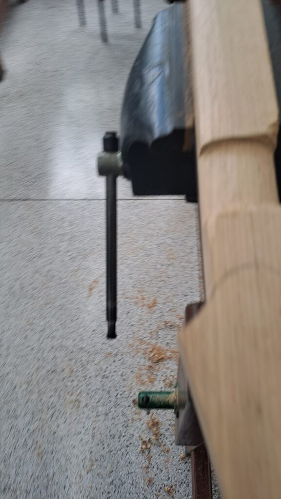Despois de rebaixar a mão, foi necessário refazer o contorno da mão e aproveitamos para já fazer o furo de acesso ao parafuso do tensor. Para fazer este furo, fizemos primeiro um inicio do furo com a giova, para deixar uma parede um pouco mais reta, pois como a parede curvada, a broca sempre tem a tendência de escorregar para cima. O furo foi feito com uma broca de mourão, e a uma velocidade bem baixa, com a mão direita (no meu caso como sou destro) empurrando a furradeira e com a mão esquerda na parte da frente controlando a direção da broca, inicialmente para baixo e posteriormente corrigindo a direção para fazer o furo sair bem no meio do parafuso.