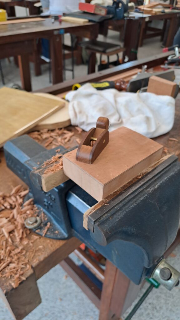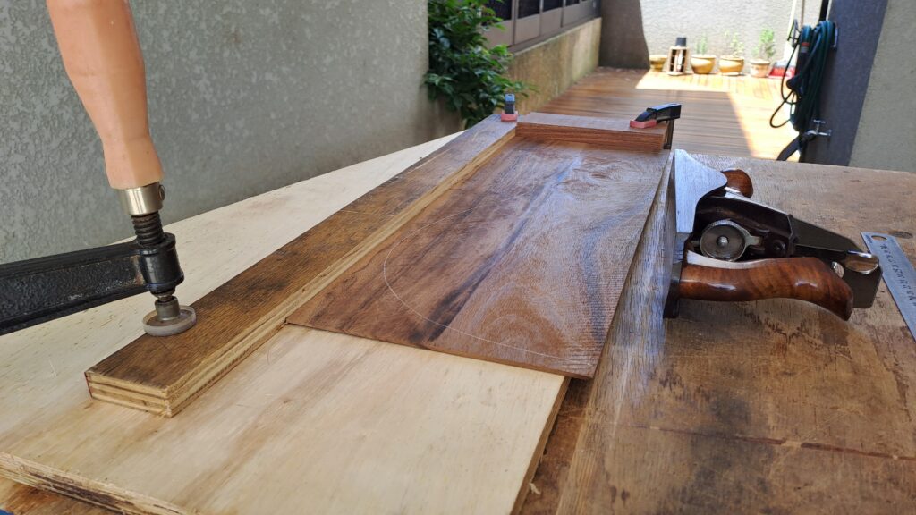 Para colar as duas metades do fundo do violão, primeiro deve-se plainar a lateral a ser cortada de tal forma que as duas metades se encostem e não passe nem um raio de luz pela emenda. Para planar esta lateral, coloca-se o fundo em uma superfície um pouco elevada e usa-se a plaina apoiada na sua lateral, como pode ser visto na imagem 02. O grande segredo para conseguir planar bem é regular a plaina até a lâmina não sair mais da fresta na sua base, então se baixa um pouco a lâmina e testa, e vai repetindo o processo até ela começar a tirar uma lasquinha bem fina. Quanto menos material a lâmina tirar, mais fácil será conseguir acertar o encaixe.