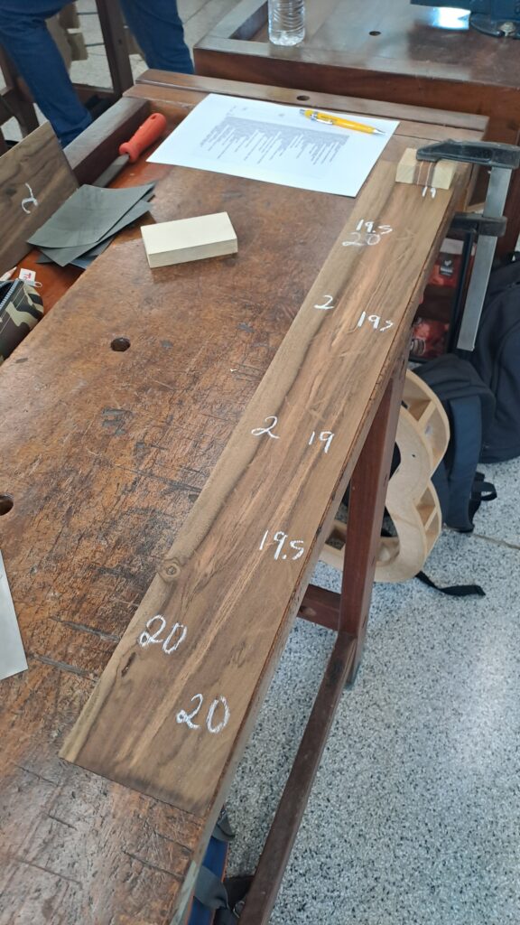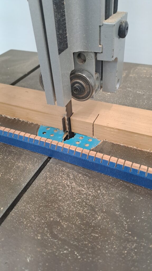 Há uma estrutura na parte de dentro das laterais da caixa acústica, que chamamos de contra-faixas, que tem a função de aumentar a superfície de contato para a colagem do tempo e do fundo com as laterais. As contrafaixas são basicamente uma ripinha longa com vários cortes para permitir que ela se torna mais maleavel e se adapta a curvatura da lateral do violão. Primeiro foi feito um pequeno chanfro em uma das laterais da contra-faixa e depois foram feitos vários cortes, usando um jig na serra-fita. É importante regular a profundidade dos corte de acordo com a madeira, para que a sobra fique fina o suficiente para deixar a contrafaixa maleável, mas ainda grossa o suficiente para ter certa resitência.