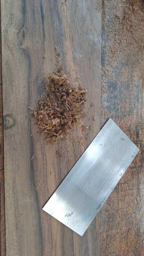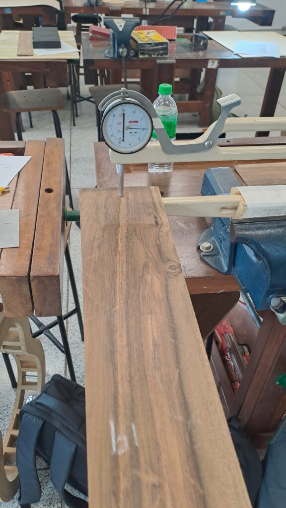 Para isso, se usa uma ferramenta chamada de especímetro. Vou passando a lateral pelo equipamento e marcando a sua espessura, e depois, com uma raspilha, eu removo o excesso de material até a lateral ficar uniformemente com 19 mm.