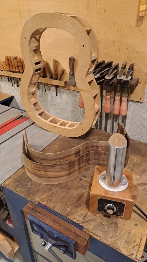 Para dobrar as laterais no formato do violão usamos um ferro que esquenta, específico para a luteria, chamado ferro de dobar. Este ferro tem um Dimer e se sabe que ele está na temperatura exata, quando se espirra aguar sobre ele e a água forma uma bolinhas que quicam sobre o ferro antes de evaporar. É muito importante que se tenha definido bem qual parte da lateral vai ficar para dentro e para fora do violão e qual extremidade vai ficar para cima e para baixo, pois uma vez dobrada, pois uma vez dobrada não é mais possível inverter os lados.