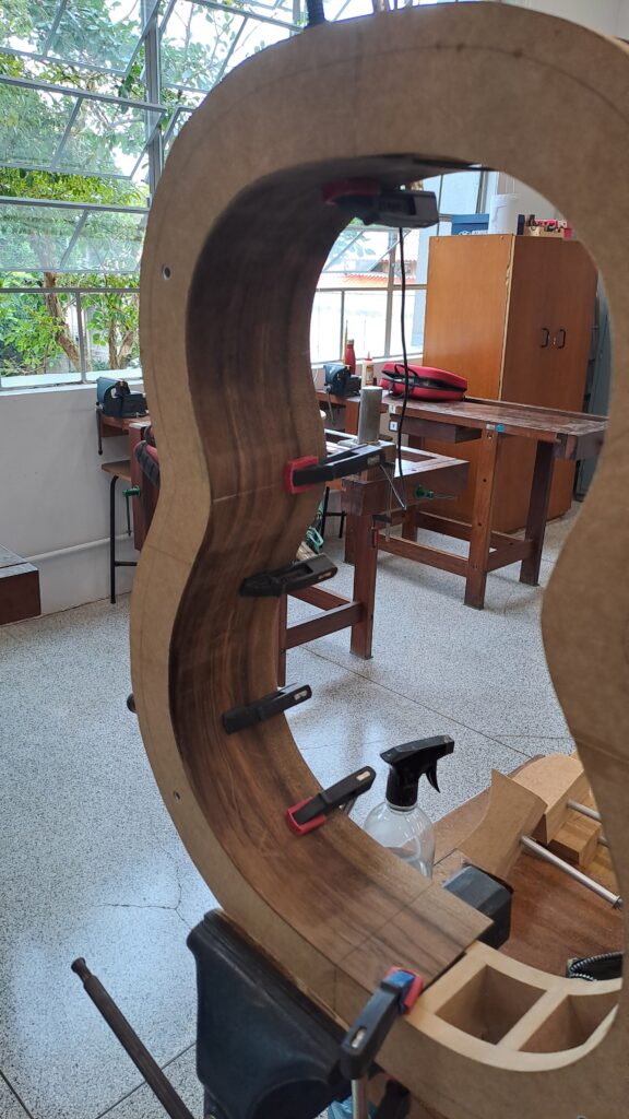 Pessoalmente achei dobrar as laterais a etapa mais difícil na construção do violão, mas com um pouco de experiência o trabalho vai ficando muito mais fácil. Depois de dobrar as laterais é muito importante que elas sejam sempre mantidas dentro da forma, pois podem acabar desdobrando se não forem guardadas desta forma.