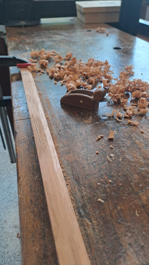 Com as duas laterais dobradas, bastou serrar as sobras na linha central. Que eu fiz com as laterais dentro da froma mesmo, porém, uma por vez. Para reforçar as emendas, há um taco colado na parte de cima e de de baixo, sendo a de cima mais grosso, pois ainda vai sustentar o braço do violão depois. O violão tem uma leve curvatura nas duas emendas e por isso o taco precisa ser arredondados, para acompanahr perfeitamente a curvatura do violão, fiz isso usando primeiro a plaina de dedo, e depois uma lixa colada na emenda onde o taco vai ser colado.