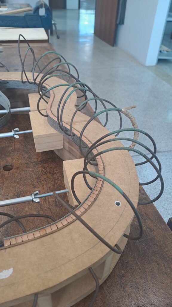 Para evitar que a contra-faixa quebre durante o corte, colamos uma fita no lado oposto, que no pior dos casos ainda vai manter os pedaços unidos, caso a contra-faixas quebrar. Antes de colar a contrafaixa no interior das laterias, fazemos o etse a seco para ver se ela se curva o suficiente para acompanhar a curvatura da lateral, caso não esteja flexível o suficiente, usamos o ferro de dobrar para aumentar um pouco a curvatura do memso. Para prensar a contra-faixa no momento da colágem existem várias possibilidades, o uso de cotonetes, grampos com elásticos ou molas de colchão, eu acabei optando po esta última.