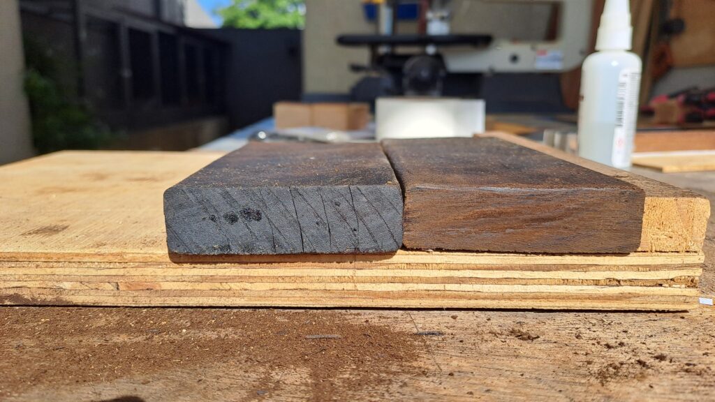 Para avaliar se o tratamento térmico havia atuado apenas superficialmente ou também na parte interna da madeira, após esse período a peça foi serrada longitudinalmente ao meio. Na análise visual, foi possível observar que a coloração escura não se restringiu à superfície exposta ao calor, mas também atingiu a região interna da madeira, indicando que o tratamento teve efeito além da camada superficial.