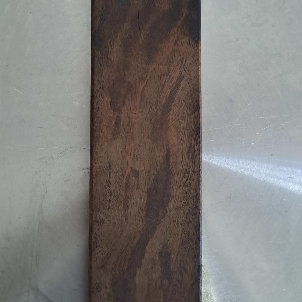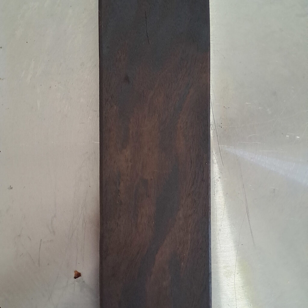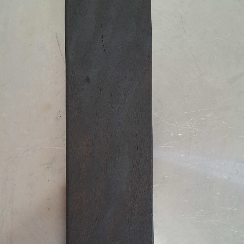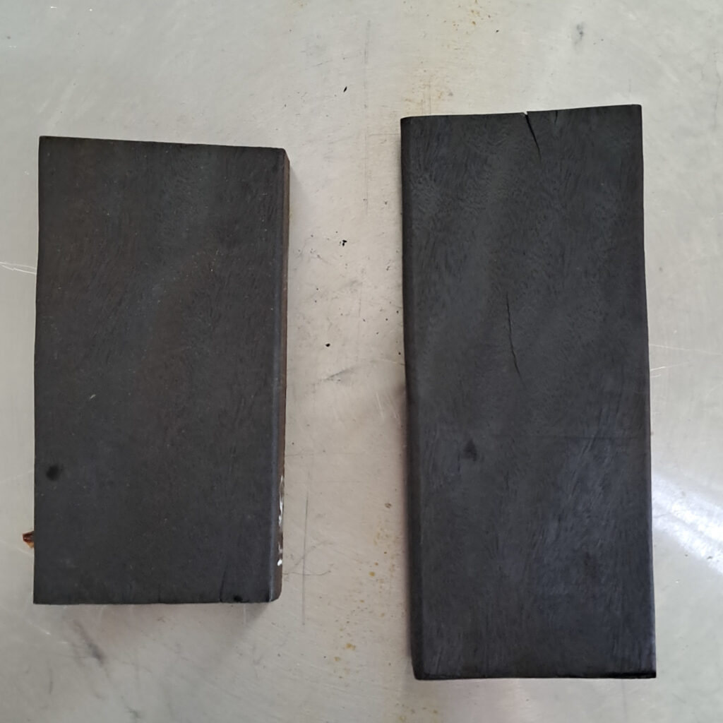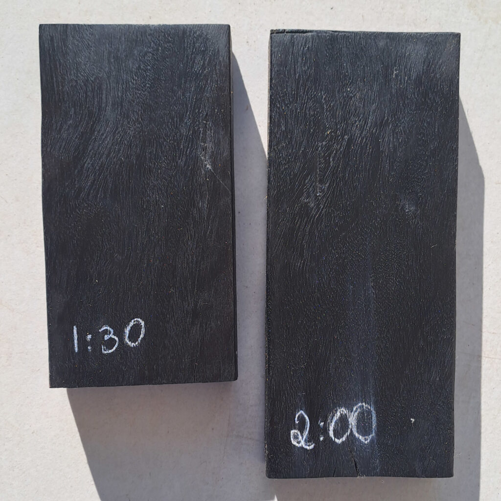 Com o objetivo de escurecer a madeira de ipê e aproximar sua aparência da do ébano africano, foi realizado um experimento de tratamento térmico, no qual a madeira foi submetida a aquecimento controlado em forno doméstico por um determinado período. O tratamento foi conduzido a uma temperatura de 280 °C, com a peça sendo virada a cada 15 minutos, a fim de garantir um aquecimento mais uniforme em todas as faces. Observou-se que a madeira passou a apresentar um escurecimento homogêneo após aproximadamente uma hora e meia de exposição ao calor.
