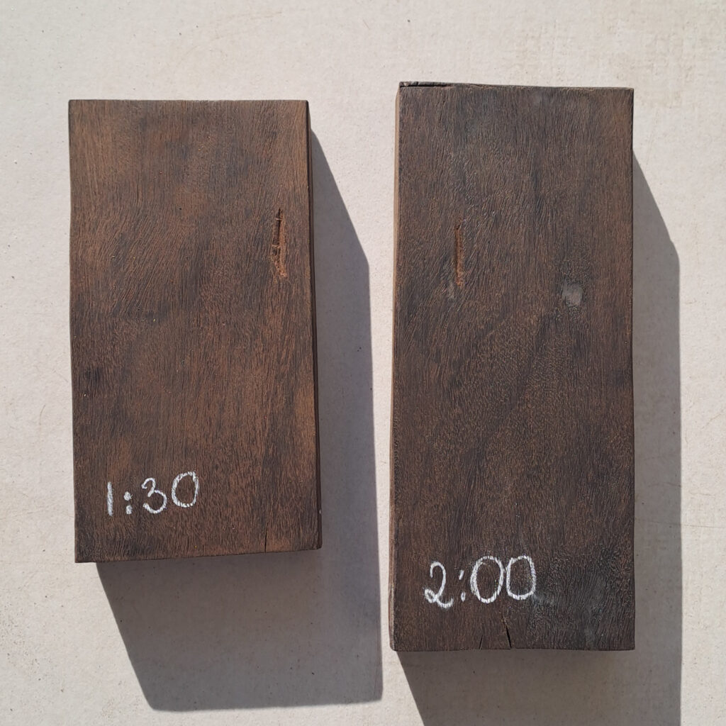 Visualmente, a diferença de coloração entre a madeira tratada por uma hora e meia e a tratada por duas horas mostrou-se mínima logo após a retirada do forno. Após o lixamento, essa diferença tornou-se levemente mais perceptível, com a peça submetida a maior tempo de tratamento apresentando tonalidade discretamente mais escura. No entanto, após a aplicação de óleo de peroba como acabamento, ambas as amostras adquiriram uma coloração praticamente preta, tornando-se visualmente indistinguíveis entre si.